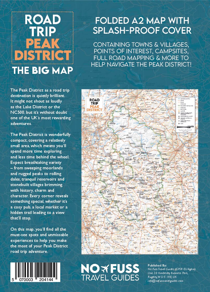 Road Trip Peak District Map by Robbie Roams! The ultimate map containing all major destinations, points of interest and roads across the Peak District. It comes as a handy A5 size to keep in your backpack or glovebox with a splash proof cover. Easily plan your Peak District Road Trip by unfolding your map to reveal the huge A2 size. There are distances between destinations and some handy tips to help you plan your adventure.